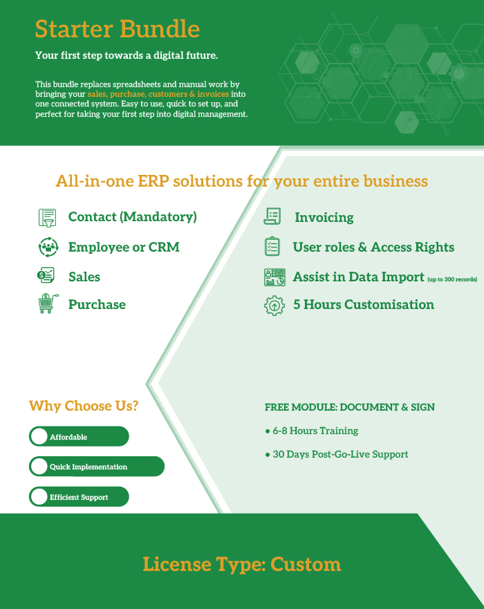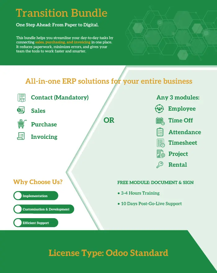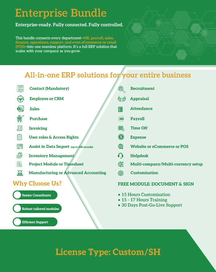 Whether you’re a startup, SME, or growing enterprise, our Odoo-powered bundles are designed to match your goals, processes, and budget.